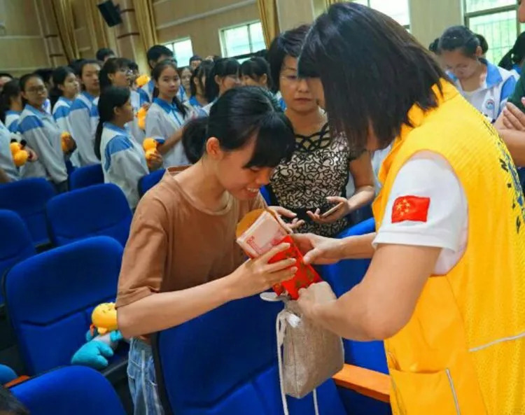 西沙服务队创队队长吴怡、现任队长吴经锐向贫困学生捐赠助学金