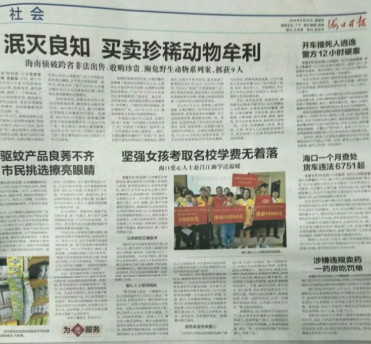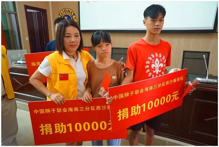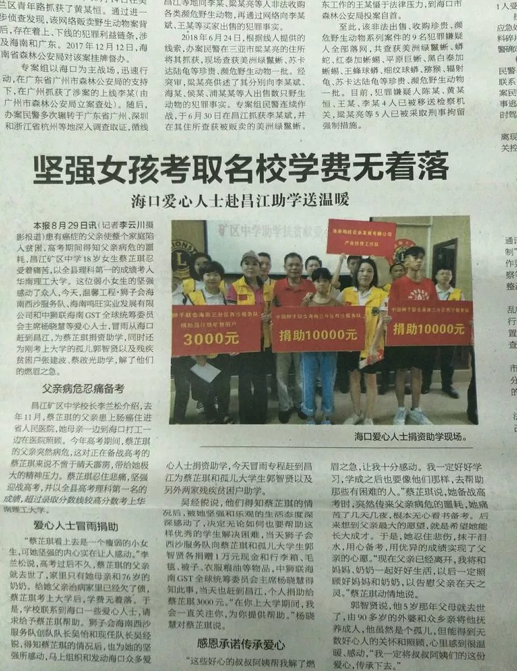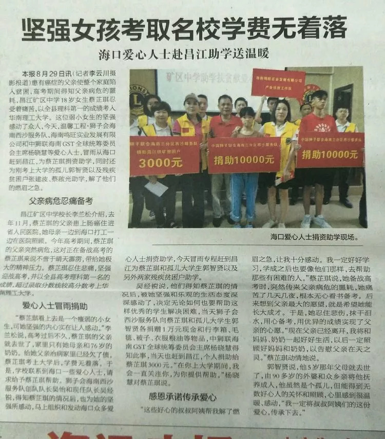 爱心人士冒雨捐助 “蔡芷琪看上去是一个瘦弱的小女生,可她坚强的内心实在让人感动。”李兰松说,高考过后不久,蔡芷琪的父亲就去世了,家里只有她母亲和76岁的奶奶。给她父亲治病家里已经欠了债,蔡芷琪考上大学后,学费无着落。于是,学校联系到海口一些爱心人士,请求给予蔡芷琪帮助。海南西沙服务队创队队长吴怡和现任队长吴经锐,得知蔡芷琪的情况后,也为她的坚强所感动,马上组织和发动海口众多爱心人士捐资助学,今天冒雨专程赶到昌江为蔡芷琪和孤儿大学生郭智贤以及另外两家残疾贫困户助学。吴经锐说,他们得知蔡芷琪的情况后,被她坚强和乐观的生活态度深深感动了,决定无论如何也要帮助这样优秀的学生解决困难,当天狮子会西沙服务队向蔡芷琪和孤儿大学生郭智贤各捐赠1万元现金和行李箱、毛毯、被子、衣服粮油等物品,中狮联海南GST全球统筹委员会主席杨晓慧得知此事,当天也赶到昌江,个人捐助给蔡芷琪3000元;他们西沙服务队同时给两家贫困户各捐赠3000元现金和粮油等生活物。“在你上大学期间,我会一直关注你,为你提供帮助。”杨晓慧对蔡芷琪说。